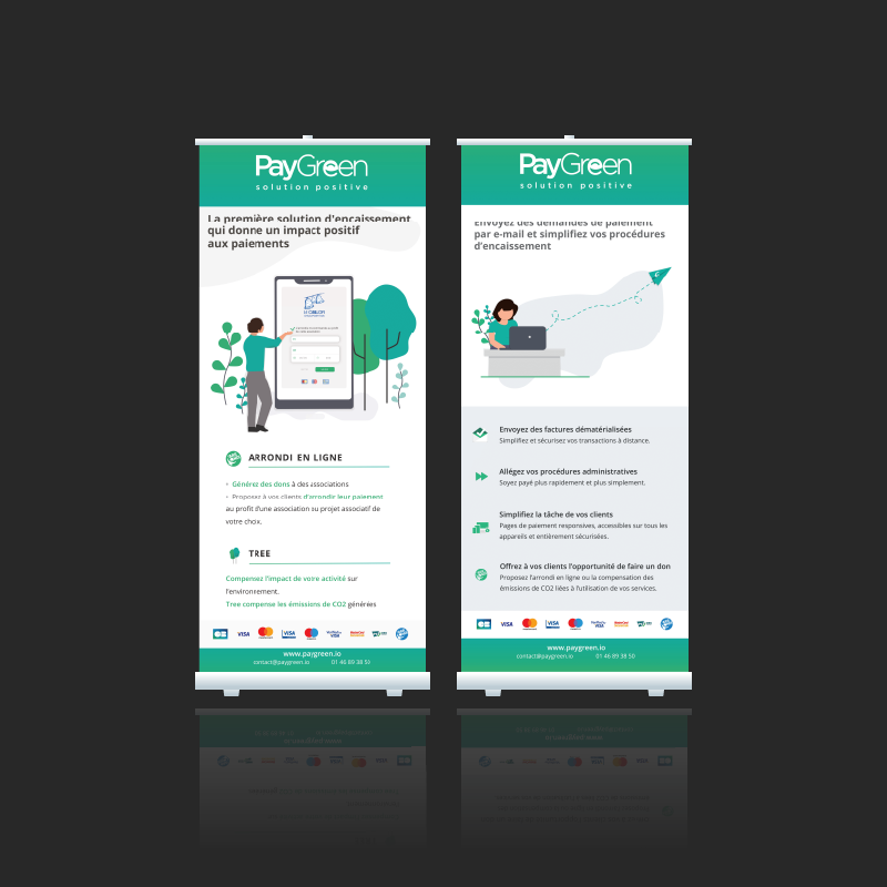 Création de kakémono pour la présence de Paygreen à des salons entrepreneuriales. Ils souhaitaient présenter leur produit à travers des visuels accrocheurs et toujours en relation avec la charte graphique de la marque.